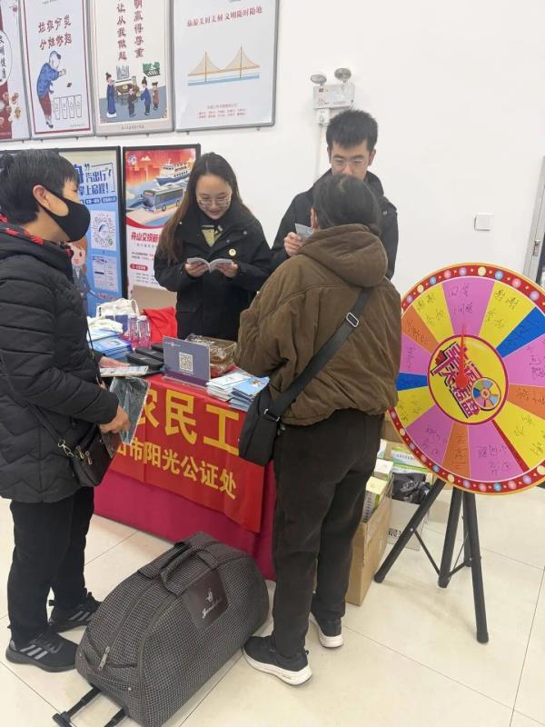 “老板拖欠工资,怎么用公证固定证据?”“异地办委托公证不用跑回老家吧?”农民工们踊跃参与问答,“卡顿”时有公证人员以案说法解疑释惑,欠薪维权、工伤纠纷中的公证应用、异地委托公证流程……实用法律知识入脑入心。公证人员还为候车农民工送上慰问品,针对农民工过年期间的法律服务需求,现场传授“浙里办”APP、“舟E公证”小程序的用法,推介可优先受理、快速办结的远程公证“绿色通道”。